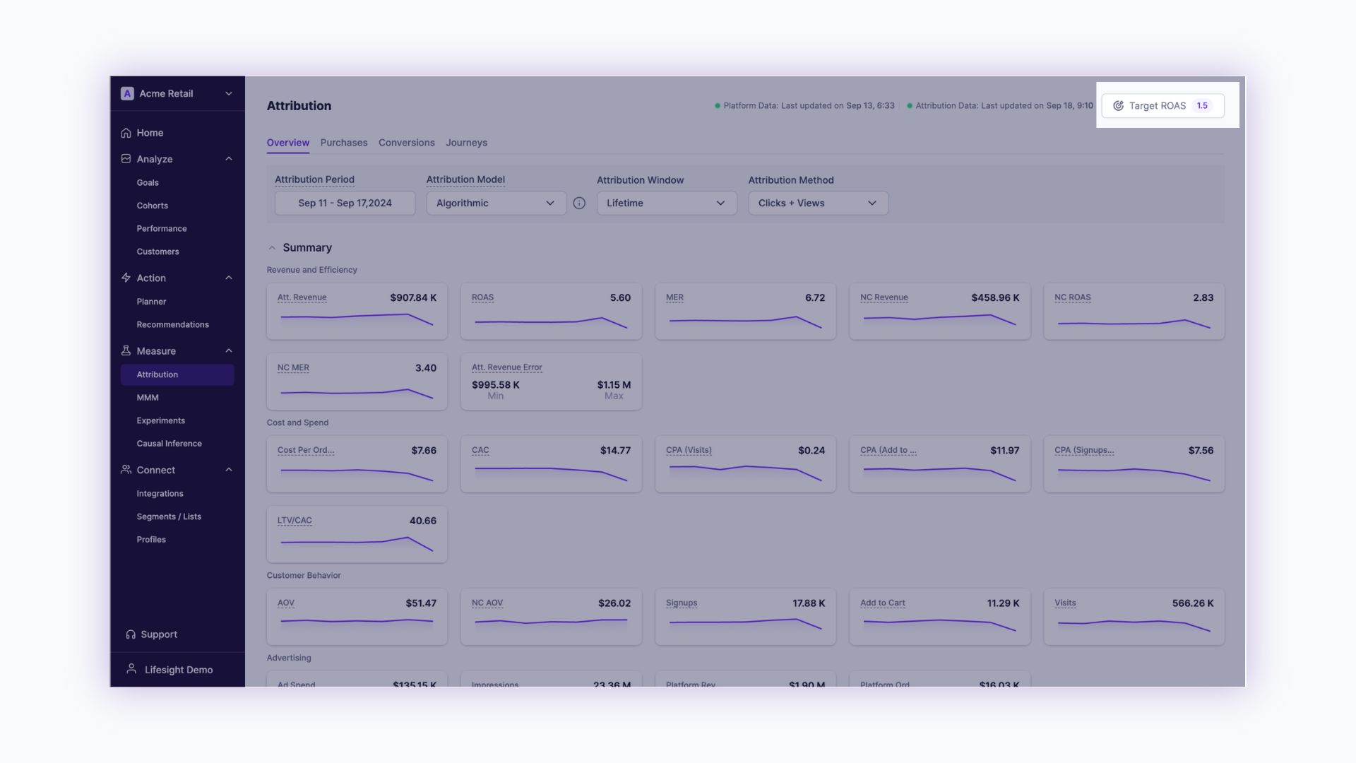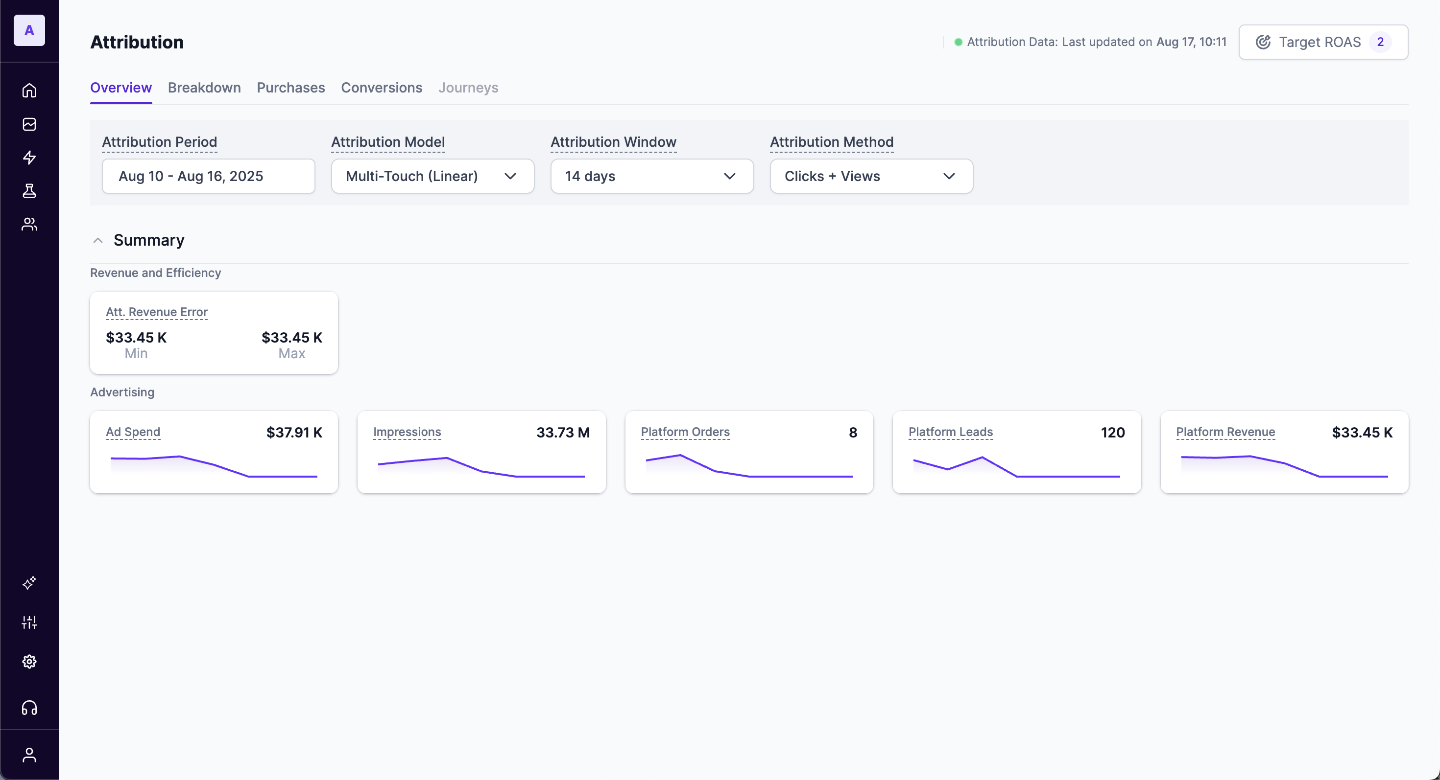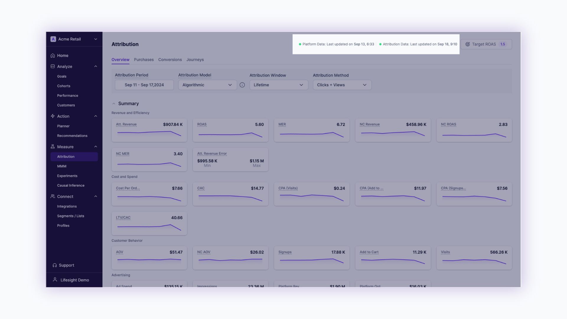 Attribution Error range (only shown for Causal Attribution models)This metrics highlights the potential discrepancies between platform-reported revenue and Lifesight's calculated revenue.