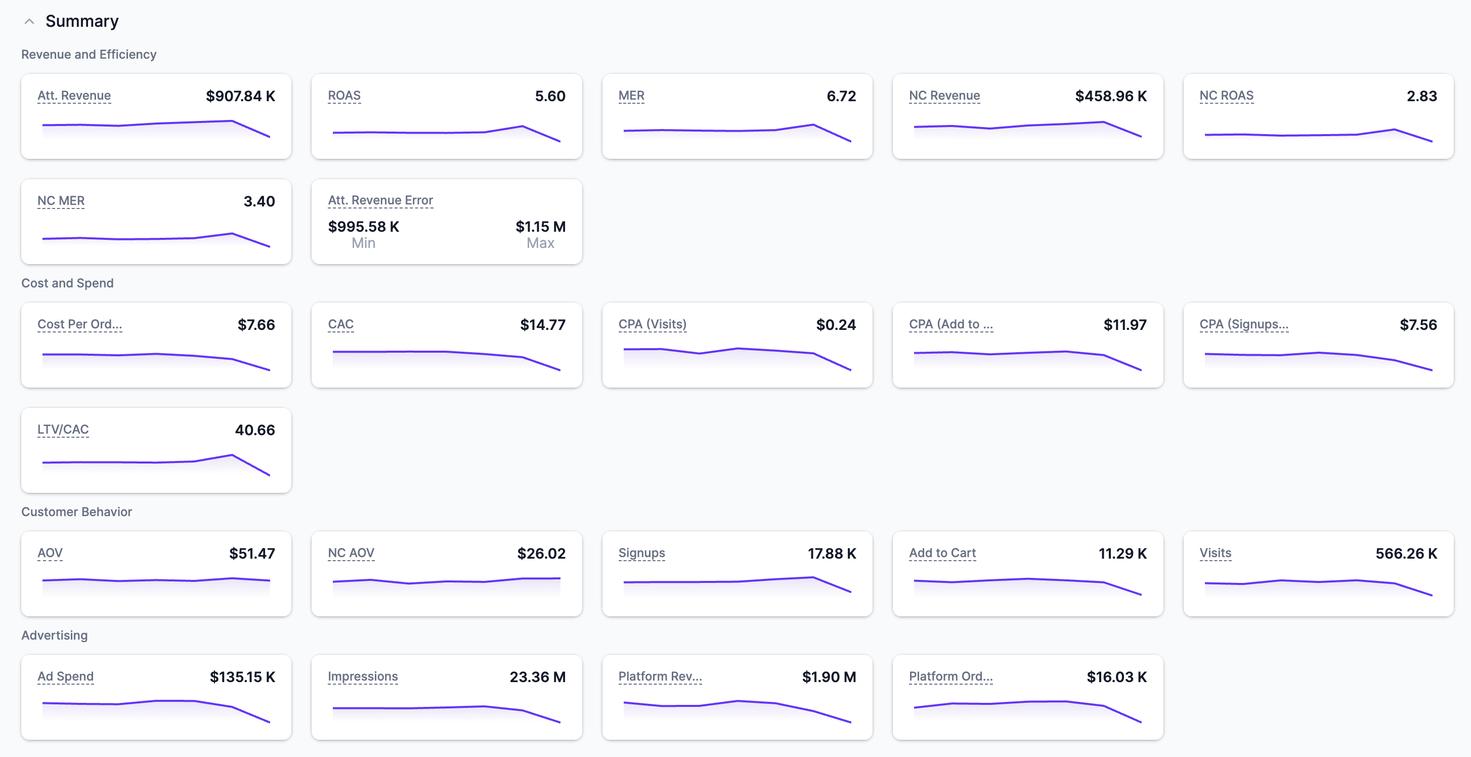 - Cost and Spend - Cost Per Order, CAC, CPA (Visits), CPA (Add to Cart), CPA (Signups), LTV/CAC