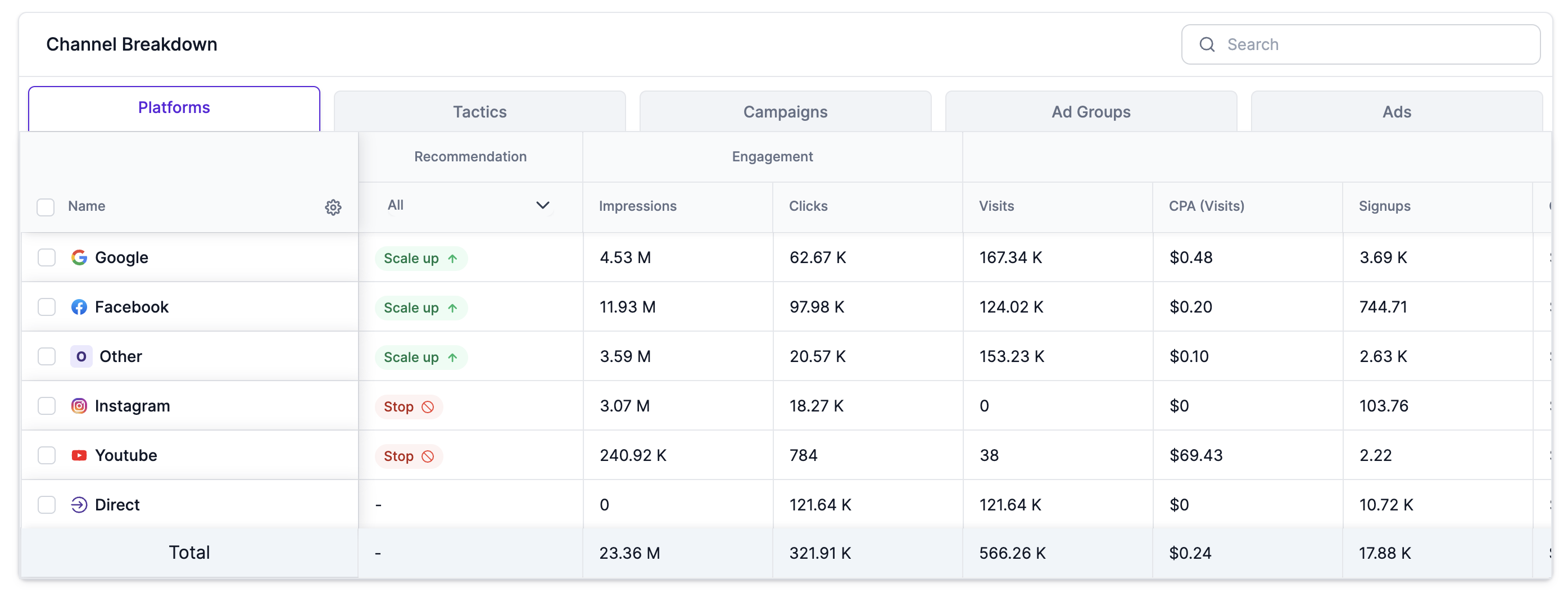 By delivering actionable insights through Recommendations like "Scale up" or "Stop," the tool helps optimize marketing efforts based on your Target Benchmark metrics set in the Attribution dashboard. Click here to learn on Target Benchmarks