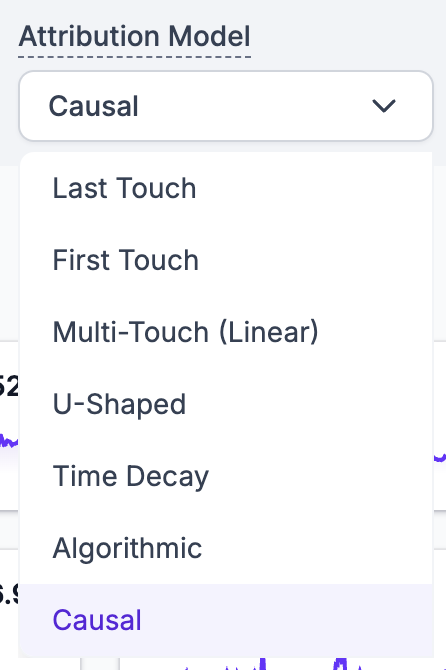 Choose between different Attribution models such as Last Touch, First Touch, Multi-Touch (Linear), U-Shaped, Time Decay, Algorithmic, and Causal.
