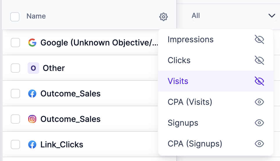 NoteThe "Settings" icon in Name section of the table helps filter the metrics you want to view in your Channel Breakdown table.