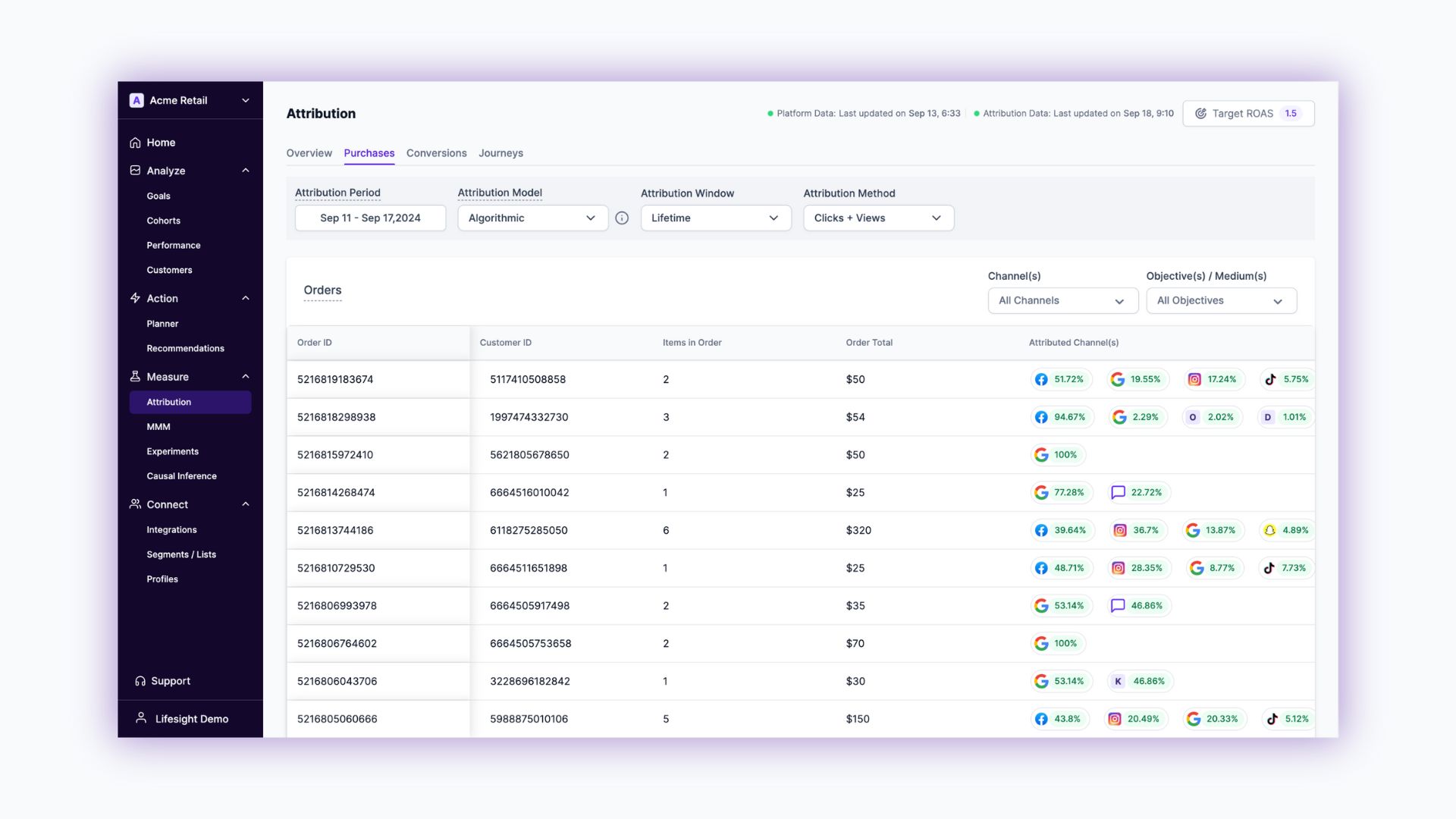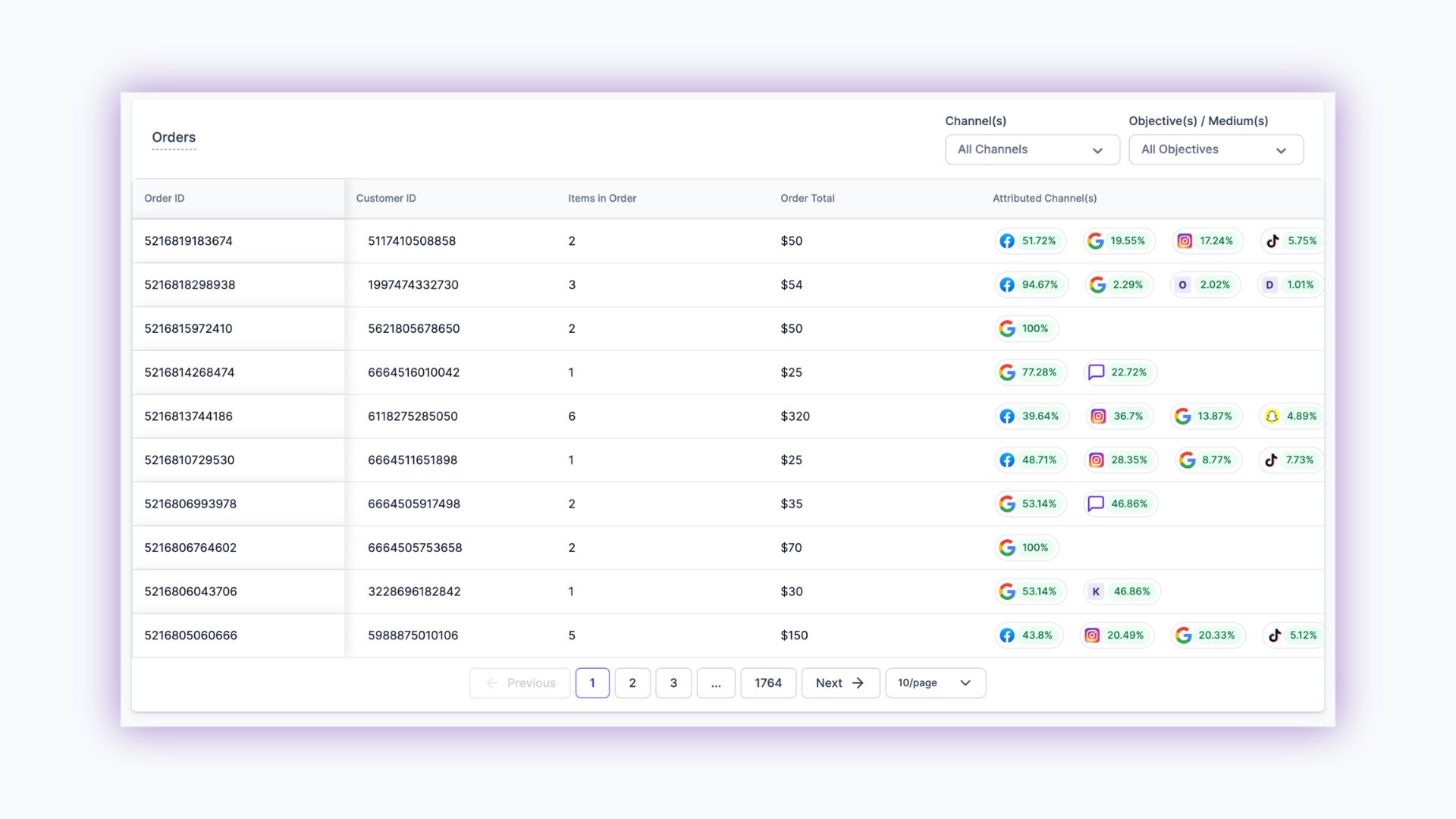 Attributed Channels: Each order is associated with its respective marketing channel(s), based on the filters applied. It provides clarity on which channels are driving your sales. It presents a detailed breakdown of the credit allocation for each advertising channel. For example, an order worth $999 might show a split such as 77.8% for CPS and 22.2% for Google, depending on the global filters set. This insight is vital for understanding the ROI of various ad channels.