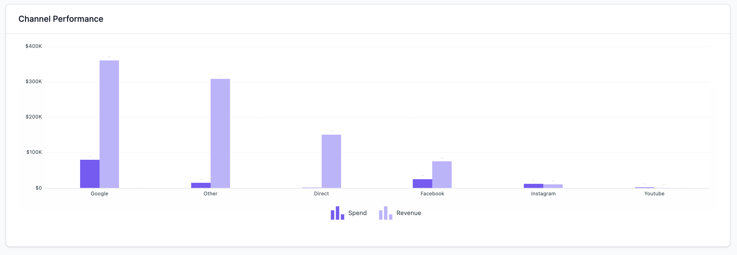 The Channel performance chart shows your media spend vs revenue for easy analysis.