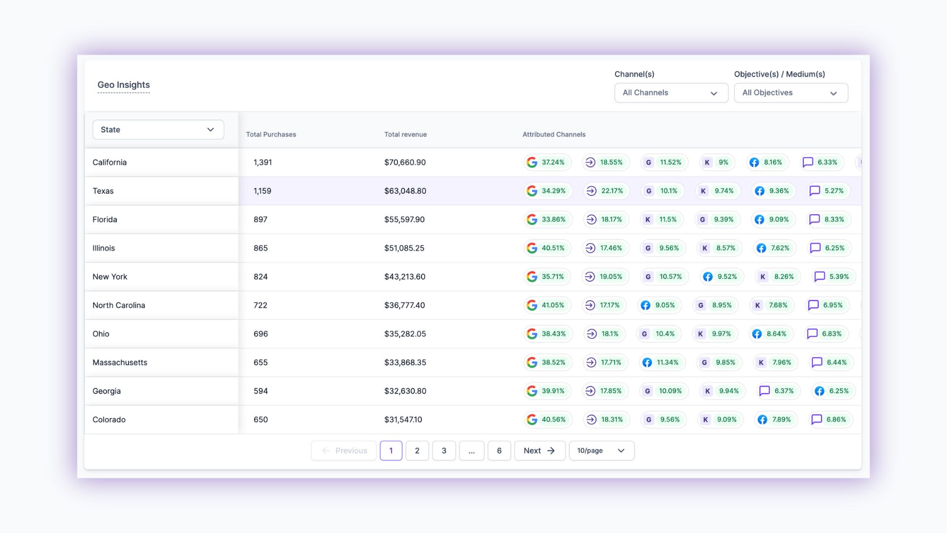Attributed Channel: The last column, indicates the percentage of credit allocated to each advertising channel for each State/City, according to global filters, providing insights into advertising effectiveness.
