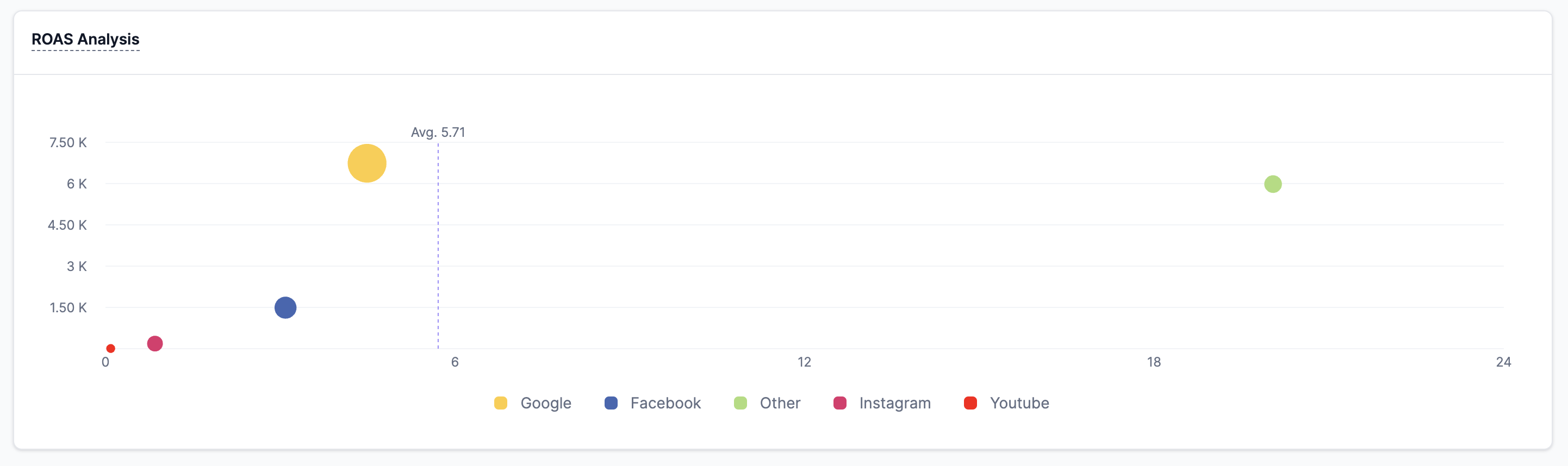 Return on Advertising Spend Analysis displays the efficiency of your ad campaigns across various platforms. The chart shows the average ROAS value (represented by the dashed line) and individual performance metrics for each advertising channel. Hover over the data points to see detailed ROAS values for each channel.