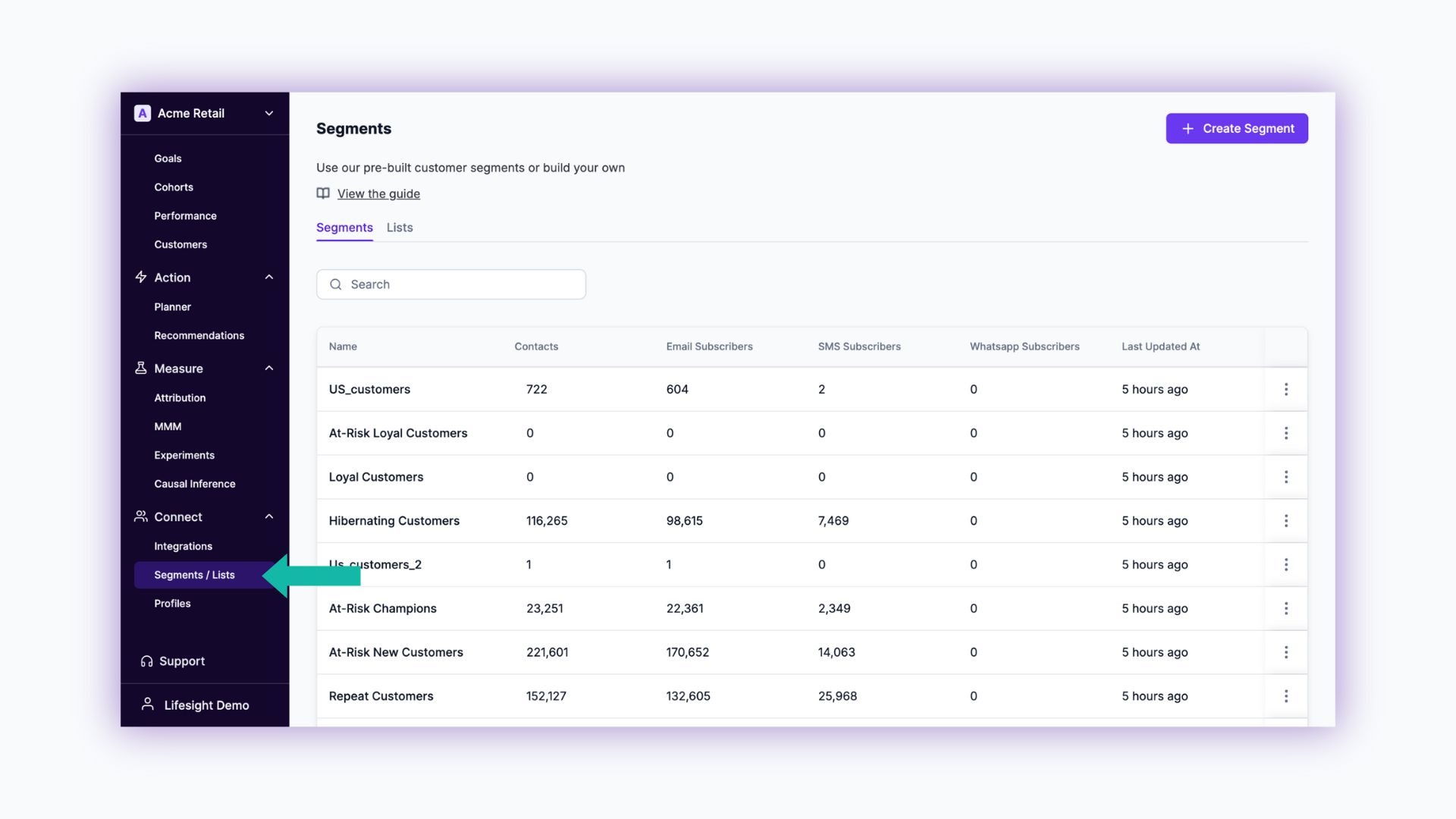 On Lifesight, you can create user segments based on behavior and traits that and send them as custom audiences to you ad channels. These segments also serve as a set of conditions that trigger, personalized marketing campaign and automations.