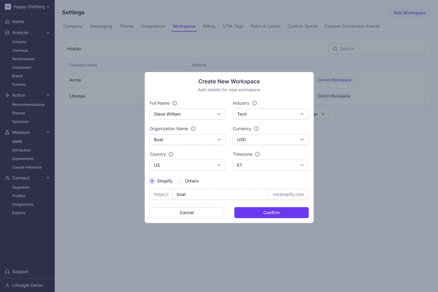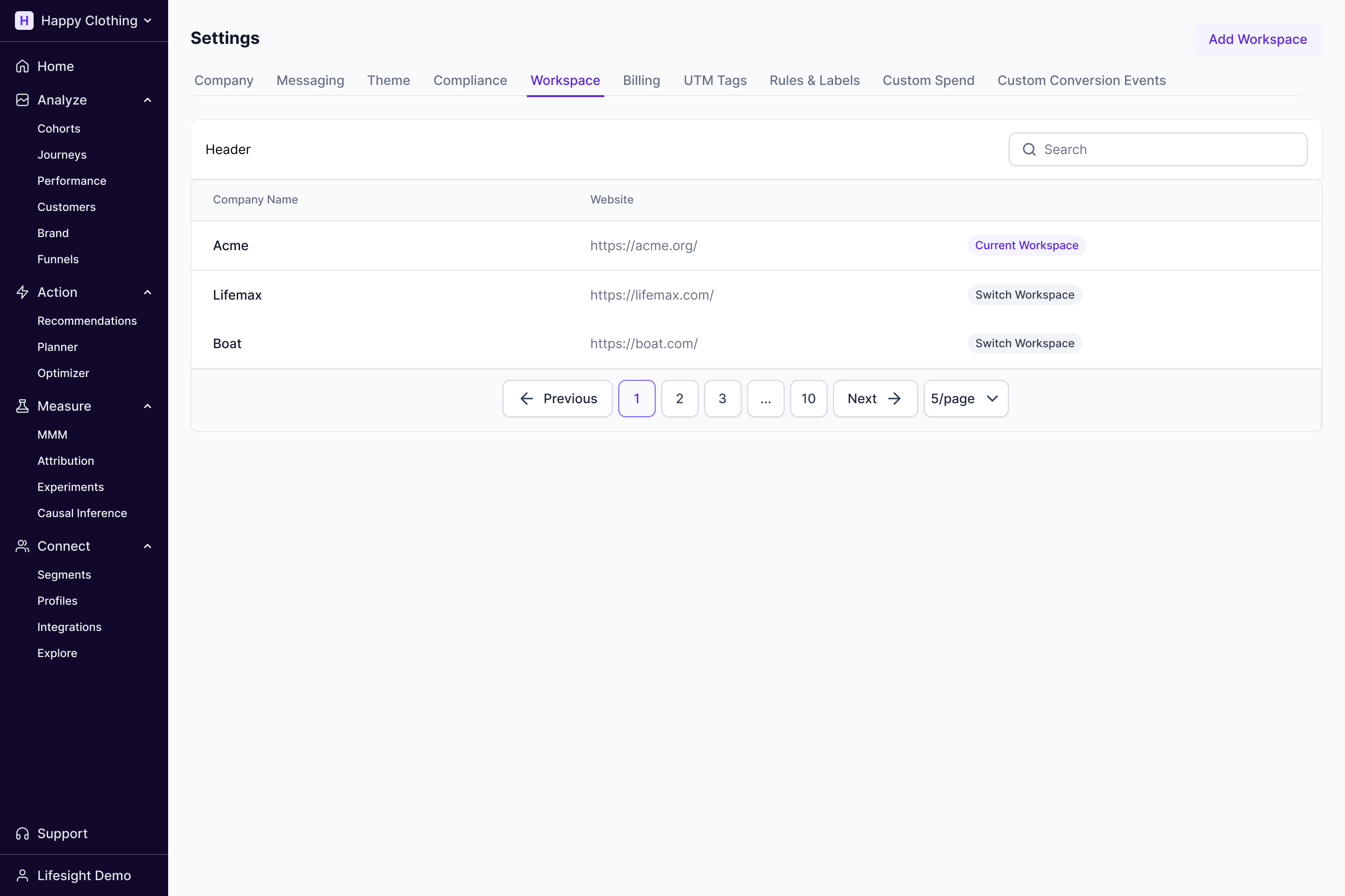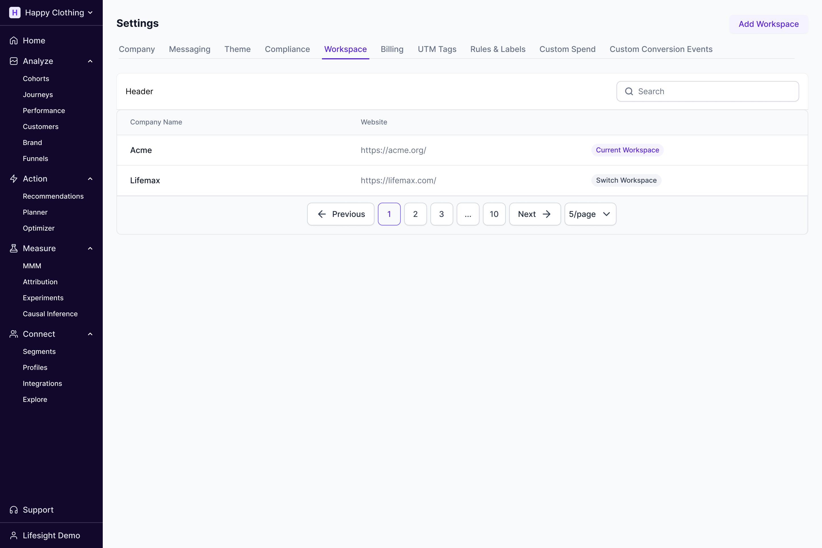 Users with the permission of "Admin" can create multiple workspaces within an account as per the signed Lifesight contract.